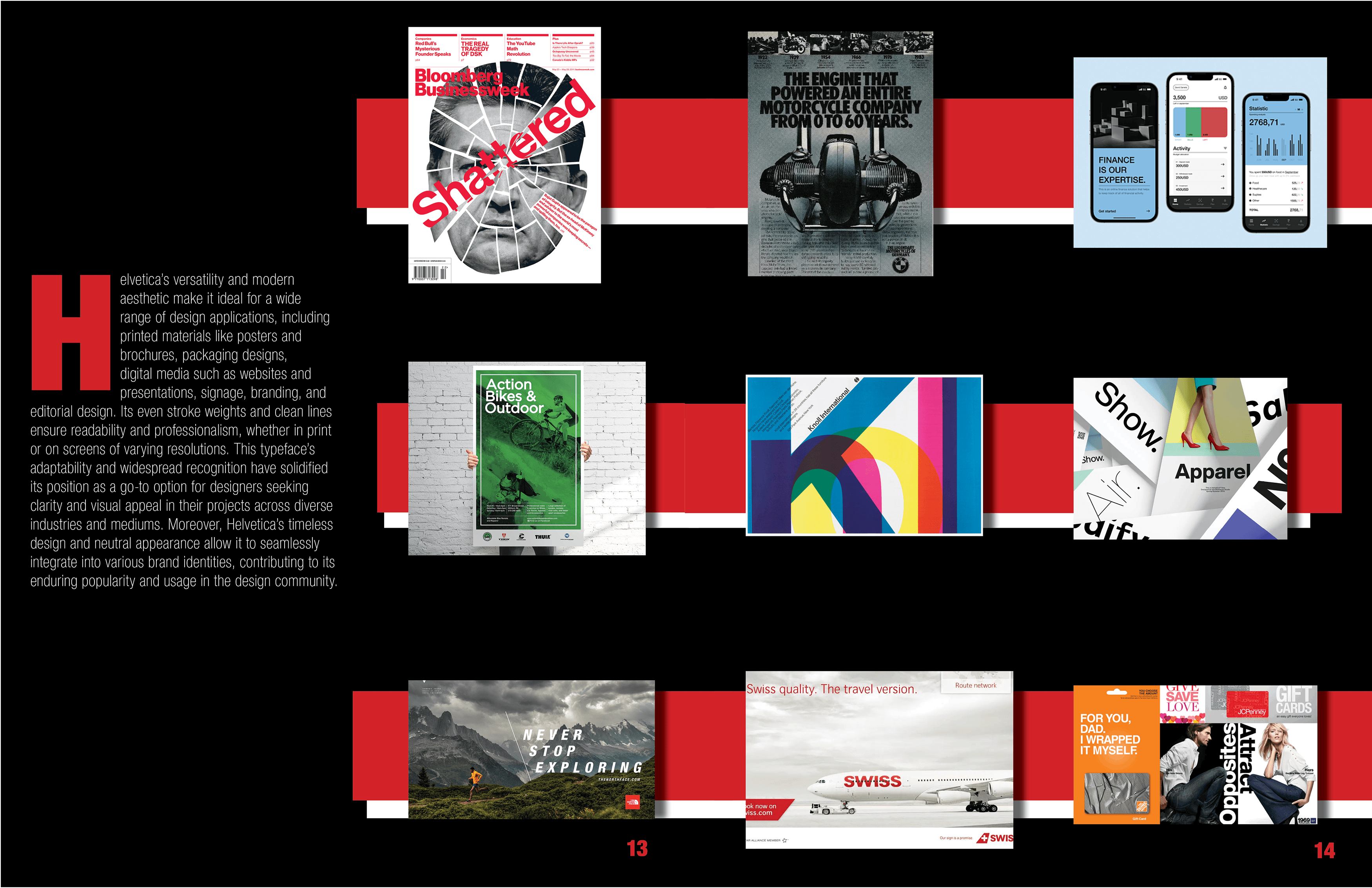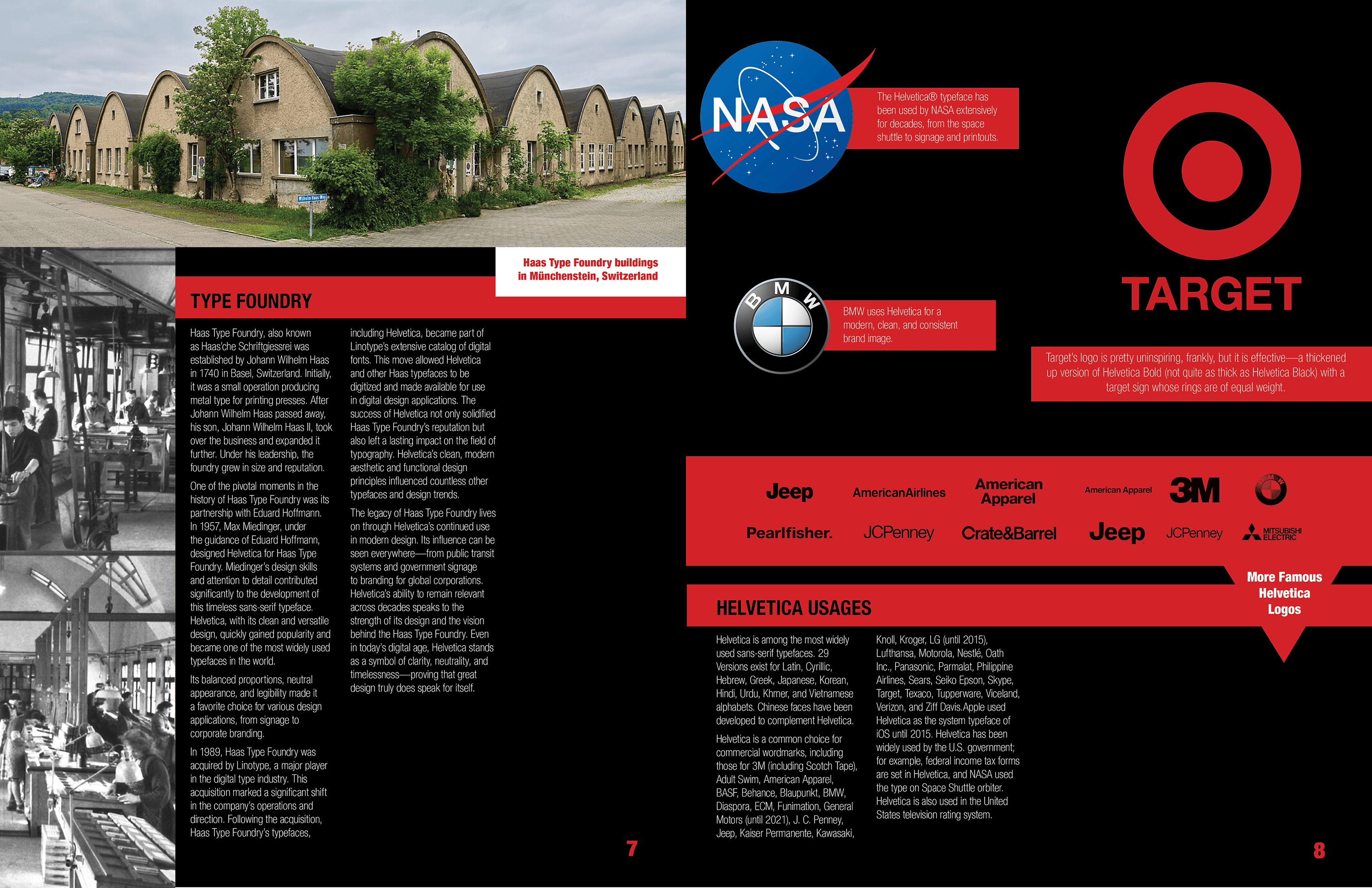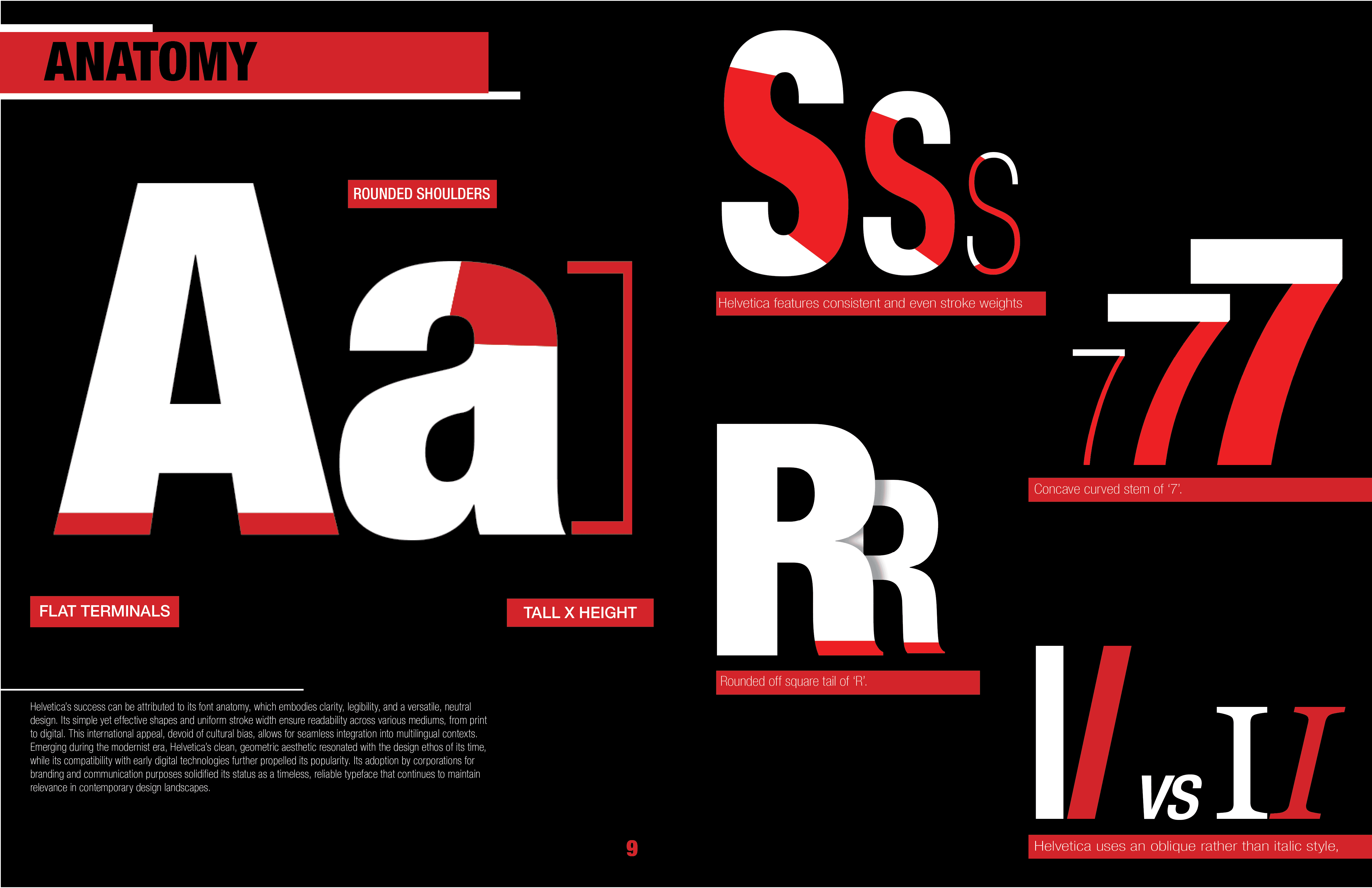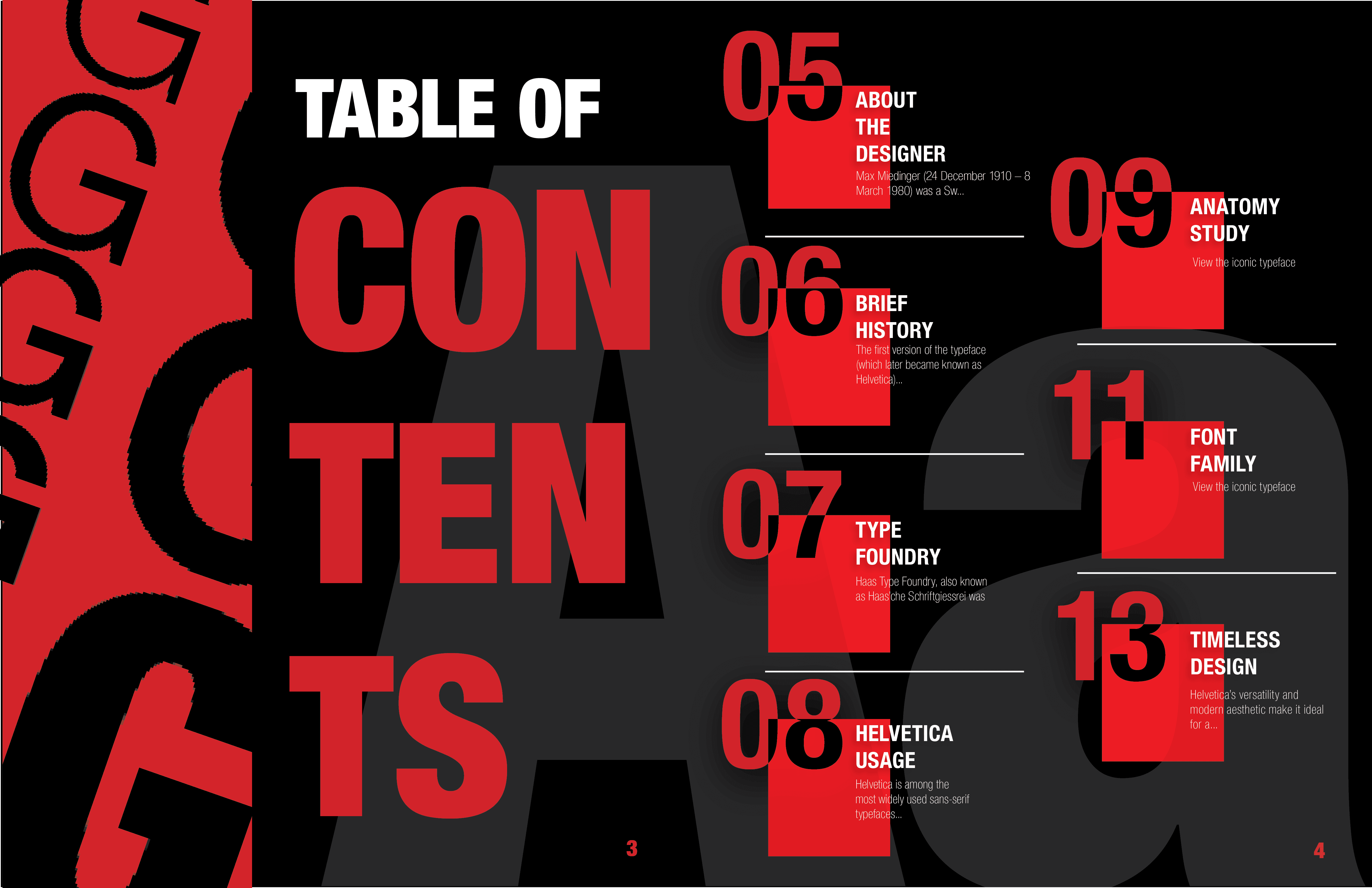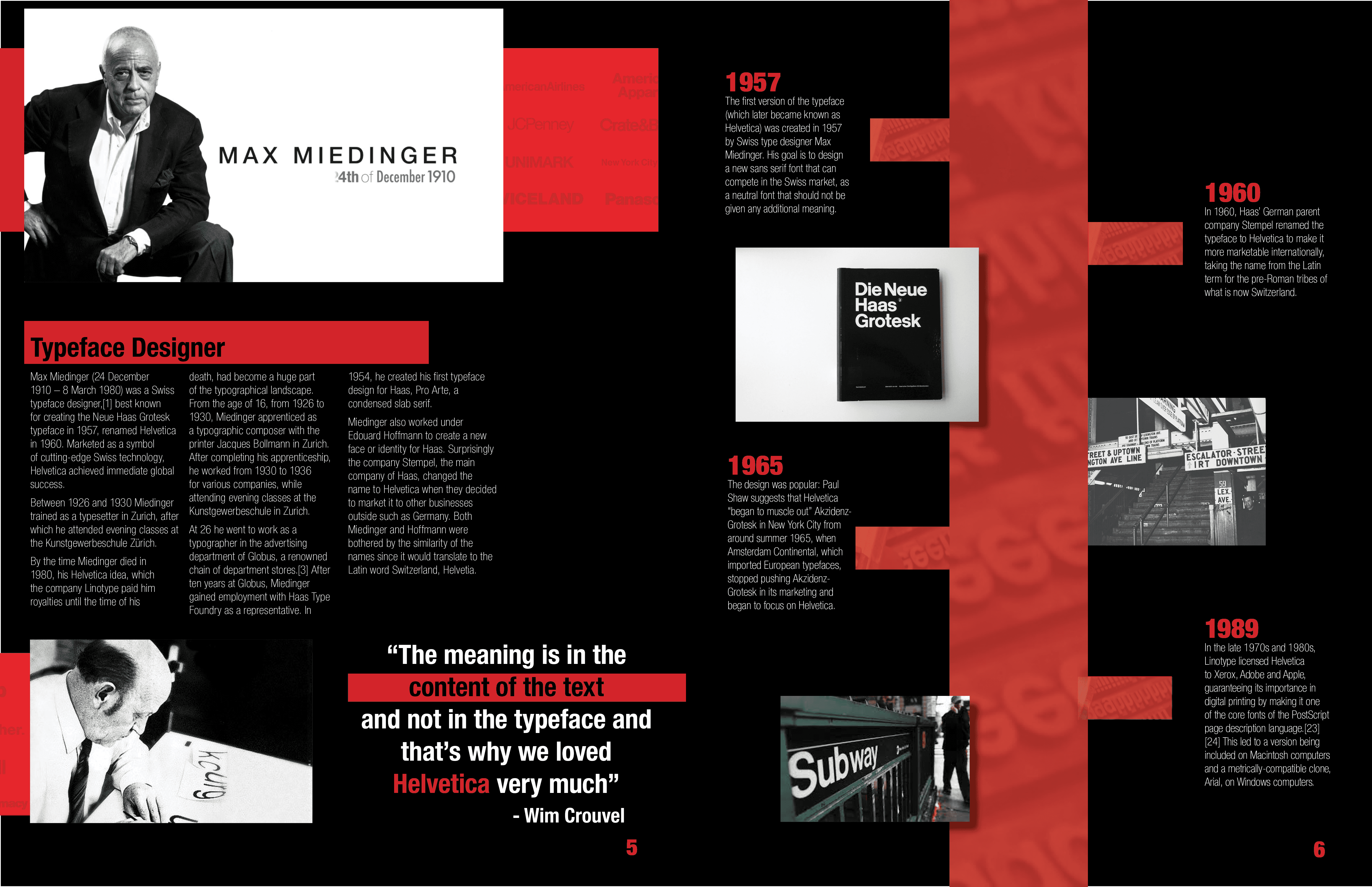 For this type specimen book, I wanted to highlight the idea that Helvetica is a typeface that “speaks for itself.” My goal was to showcase its iconic presence and versatility across different contexts, while also exploring its deep history—tracing back to Max Miedinger and the Haas Type Foundry. The design emphasizes Helvetica’s timelessness through simple, direct layouts that let the type take center stage.